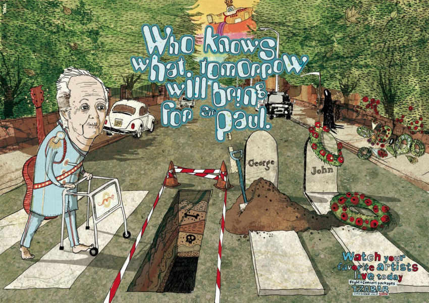 Резонансный принт однажды выпустило туристическое агентство Tzabar. Предложение о путешествиях оно решило проиллюстрировать аналогом легендарного снимка на пешеходном переходе — вместо музыкантов на нем были изображены могилы. Слоган «Кто знает, что завтра с ними случится», конечно, всё пояснил, но менее спорной эту кампанию не сделал.