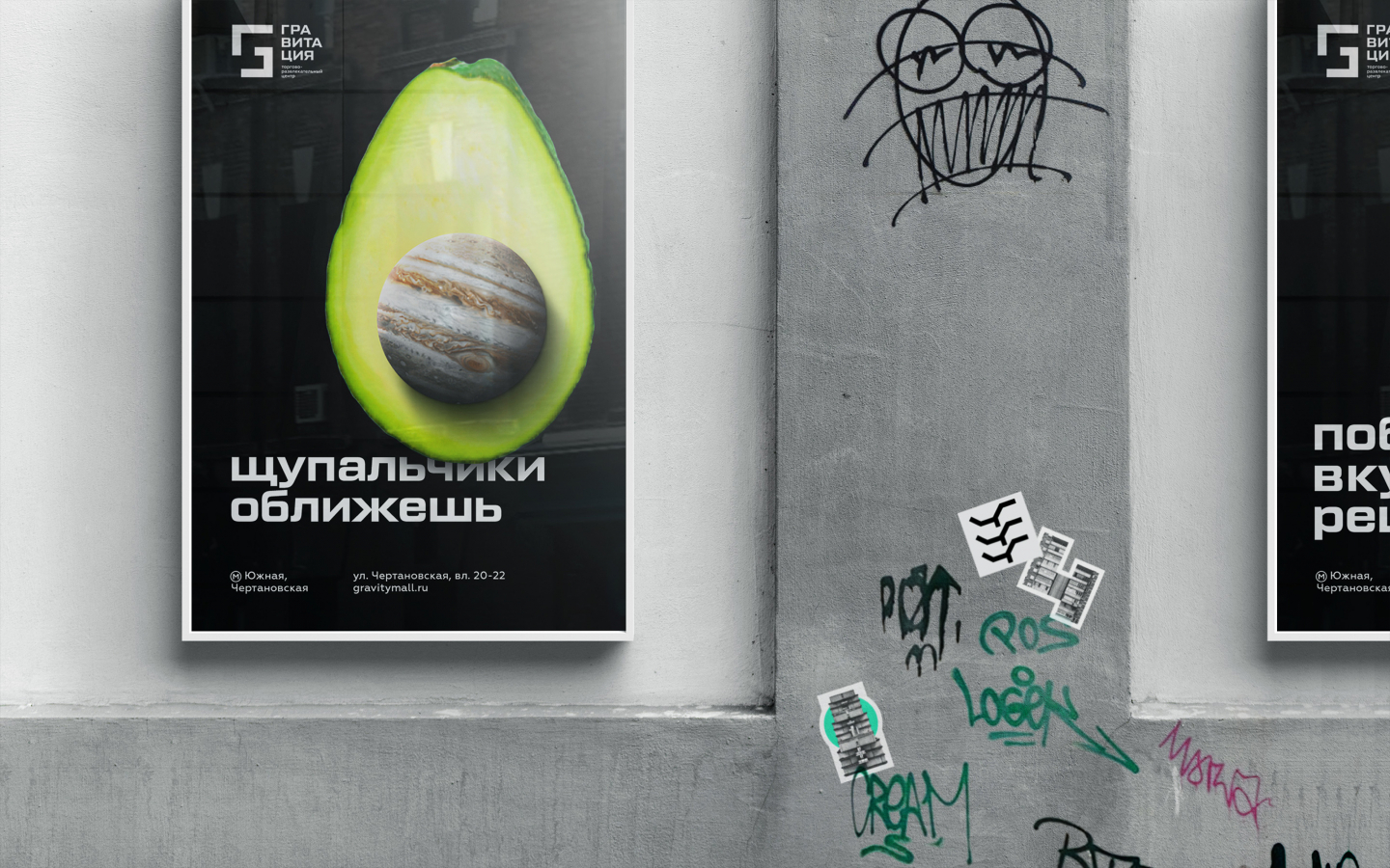 The Clients была поставлена задача создать брендинг, который не только выделит «Гравитацию» в клаттере коммерческой недвижимости, но и превратит молл из инородного элемента в еще один символ гордости для местных жителей.