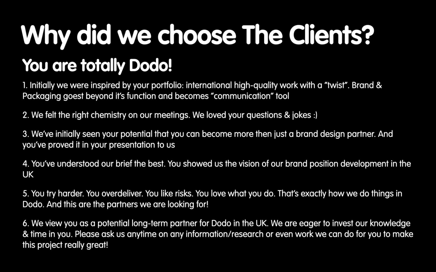 Но когда мы выиграли, клиент не только опубликовал пост с приятными словами о нас, но и выложил нашу презентацию на всеобщее обозрение. Это было непривычно, но интересно.