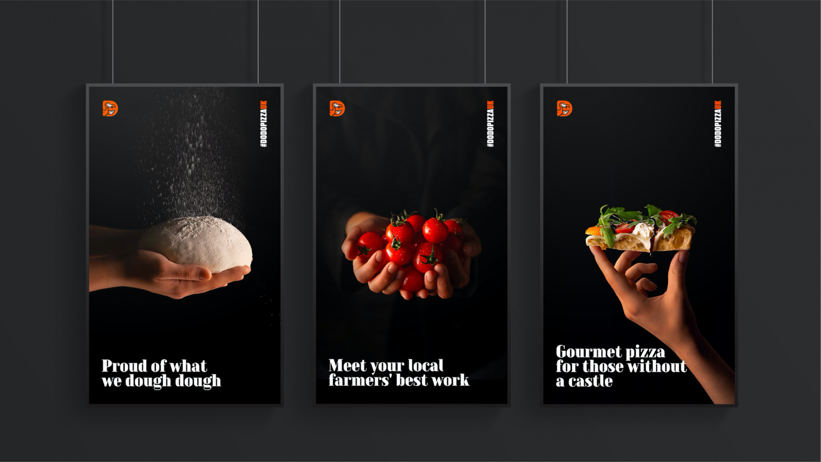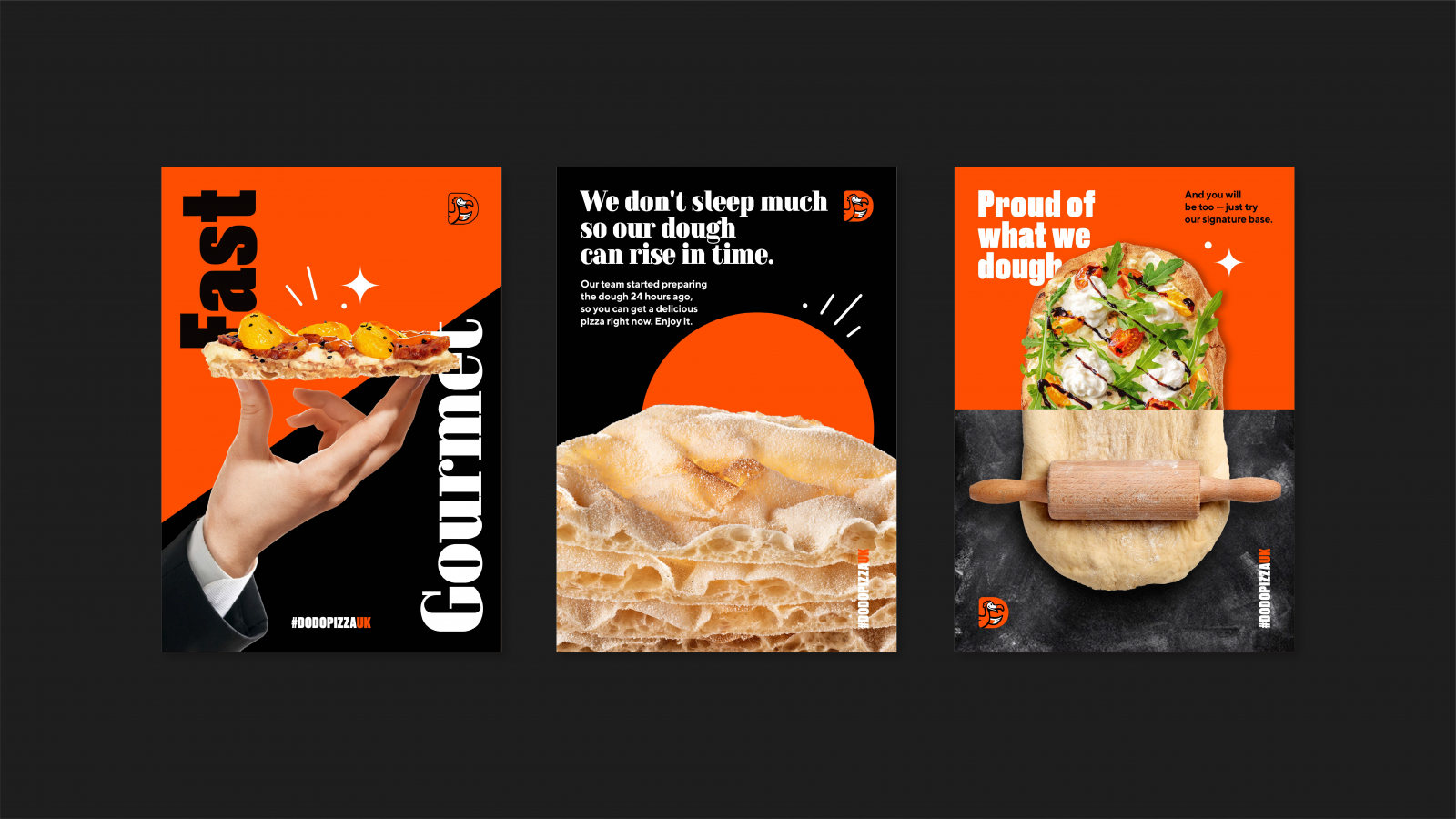 К этому этапу мы получили фото пицц и начали разрабатывать фотостиль и коммуникацию с реальным продуктом -сделали множество кивижуалов, чтобы понять, как концепция работает в постерах и в соцсетях.