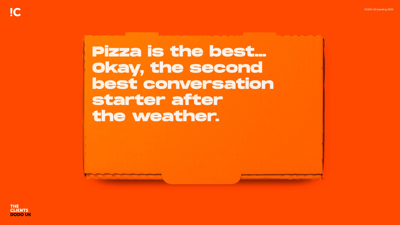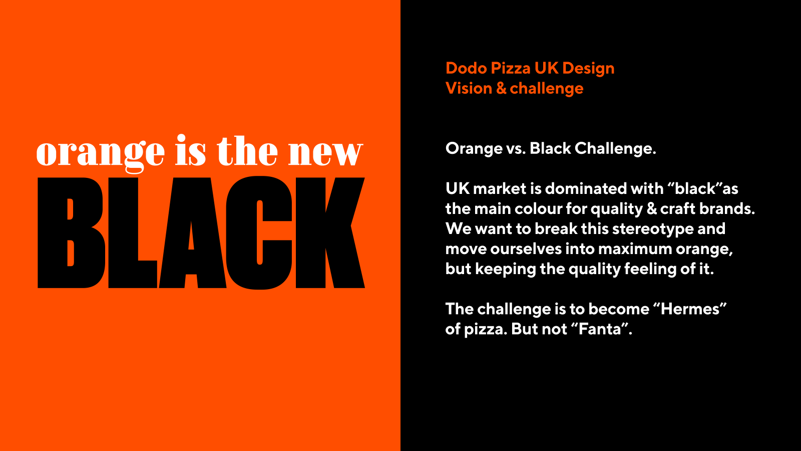Вывести бренд в Великобритании на новый уровень — это и была задача брифа. Сделать ярко-оранжевый визуальный стиль в культуре, где главная ценность — сдержанность? Выделиться с брендом пиццы на рынке, переполненном всеми видами пиццы? Попасть в сердечко жителей такого далекого от нас острова? Конечно, мы сказали «да» и отправили заявку на участие в тендере. Всего в нем было 49 агентств — мы вошли в шорт-лист.