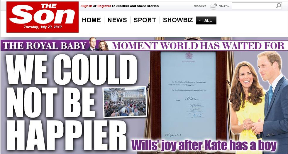 Сегодняшний выпуск газеты вышел под заголовком «Мы не могли бы испытать большего счастья». Именно эти слова произнес принц Уильям после рождения сына.