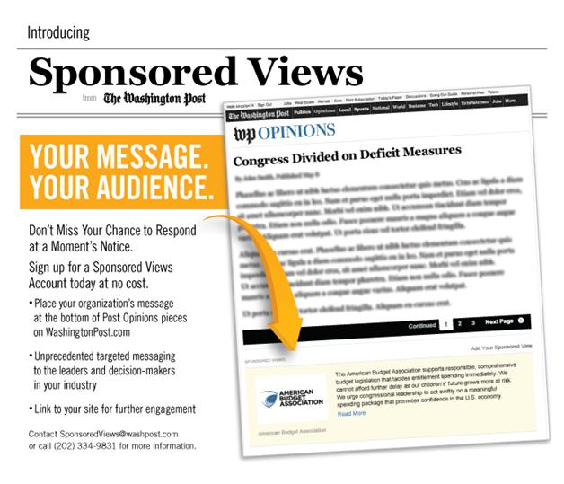 Предложение The Washington Post рассчитано на специалистов по связям с общественностью и властными структурами. Издание заявляет, что таким образом компания или организация сможет довести свою точку зрения до целевой аудитории. Например, одним из первых заказчиков Sponsored Views стал Национальный совет по охране природных ресурсов (NRDC) – ведомство заплатило за комментарий к статье о возможном введении налога на углекислый газ. Реформа вызвала споры в США из-за угрозы экономическому росту. В своей реплике NRDC настаивает, что необходимо стремиться к сокращению выбросов углекислого газа и поддерживать предприятия, которые не вредят окружающей среде.