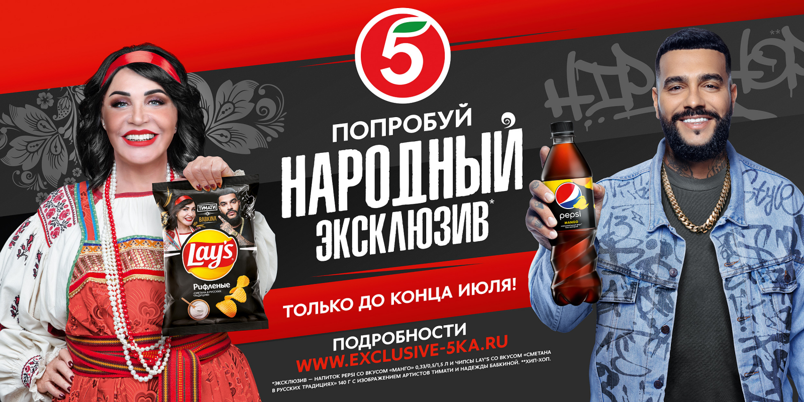 Пятёрочка и PepsiCo запустили совместную акцию «Народный эксклюзив». Надежда Бабкина стала лицом нового вкуса чипсов Lay’s «Cметана в русских традициях», а Тимати — напитка Pepsi со вкусом «Манго».
