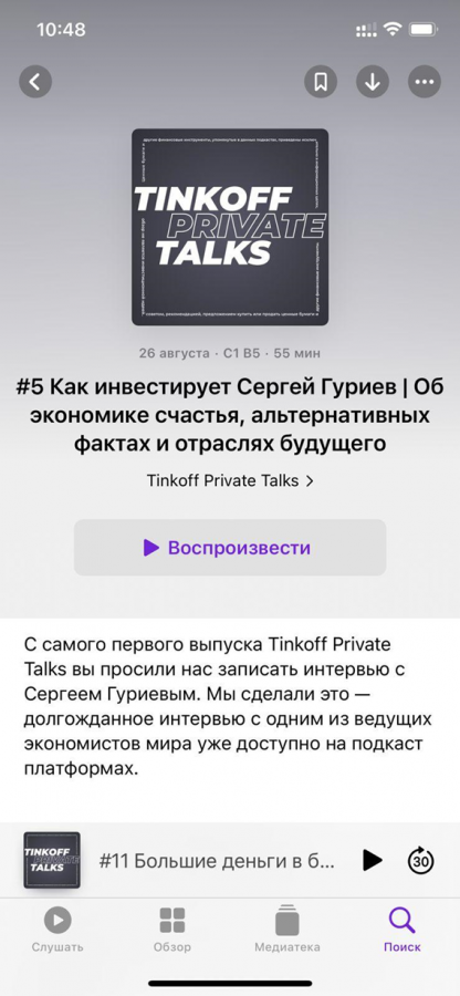 В 2021 году «Тинькофф Инвестиции» запустили ещё один подкаст — Tinkoff Private Talks. Это аудиоверсия одноимённого YouTube-шоу. На данный момент этот подкаст набрал 200 тыс. прослушиваний.