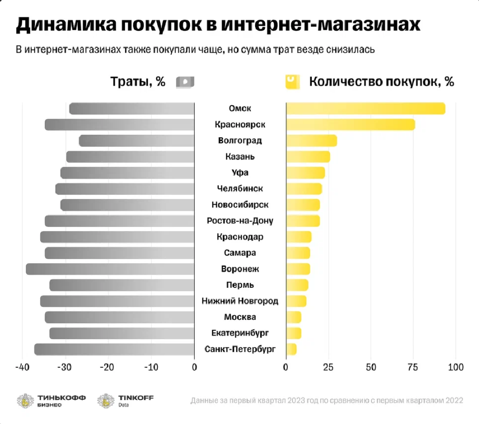 В исследовании представлены данные по транзакциям клиентов «Тинькофф» в городах-миллионниках за первый квартал 2023 года, которые сравниваются с аналогичными показателями 2022 года.