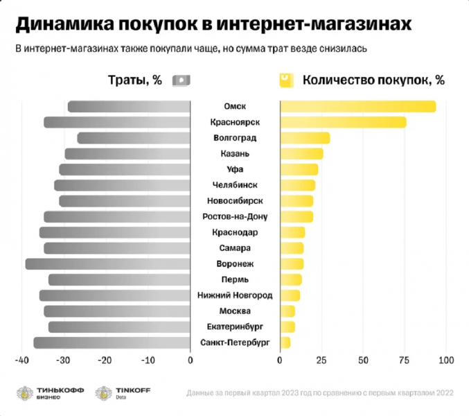 Рост числа покупок произошёл и у интернет-магазинов. Однако в сравнении с маркетплейсами он существенно ниже — от 6% до 30% во всех городах-миллионниках, кроме Омска и Красноярска. Эти города показали динамику в 94% и 76% соответственно. Однако суммы покупок в интернет-магазинах сократились везде: падение составило от 27% до 39%. В Волгограде зафиксировано наименьшее снижение, а наибольшее — в Воронеже.