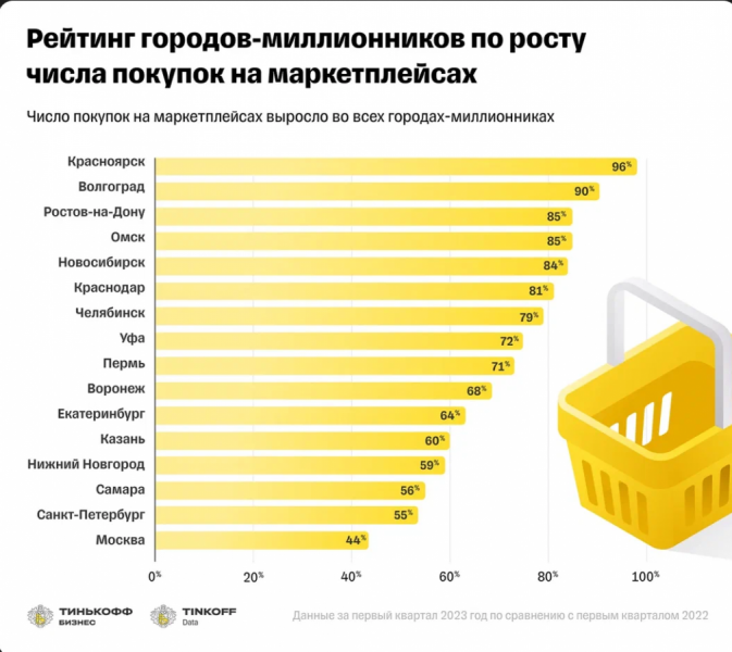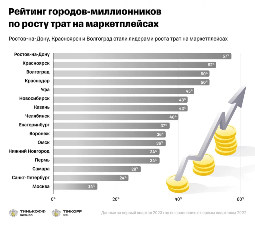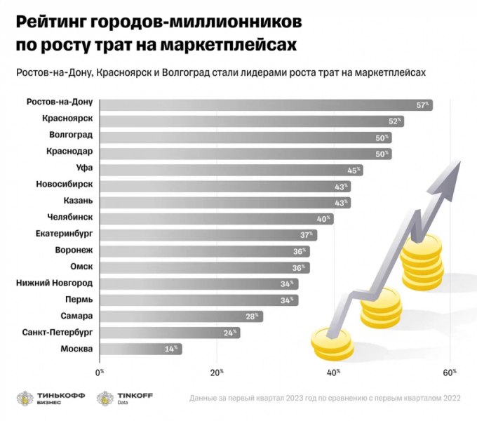 Больше всего траты на маркетплейсах выросли в Ростове-на-Дону — показатели увеличились на 57%, подсчитали Tinkoff eCommerce и аналитический проект Tinkoff Data. Также в топ-5 городов вошли Красноярск (52%), Волгоград (50%), Краснодар (50%), Уфа (45%).
