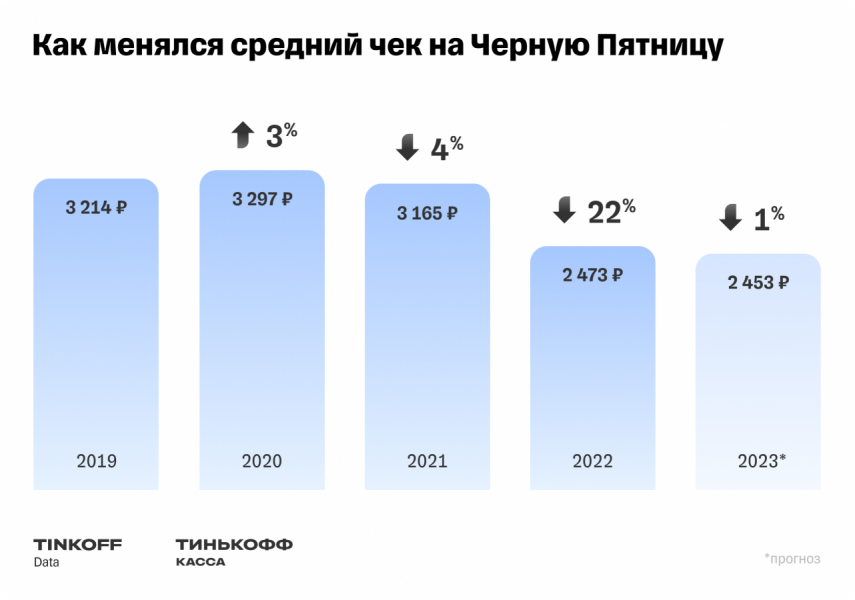 Средний чек в «Чёрную пятницу» снижается с 2019 года. В этом году он достигнет минимальных значений за пять лет — 2453 руб. По словам аналитиков, россияне совершают больше покупок по количеству, но по меньшей цене.