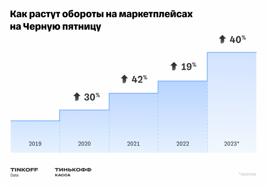 Обороты маркетплейсов в дни распродажи ежегодно увеличиваются. В 2020 году рост составил 30%, в 2021 — 42%, в 2022 — 19%. В этом году маркетплейсы могут нарастить обороты в «Чёрную пятницу» на 40%.