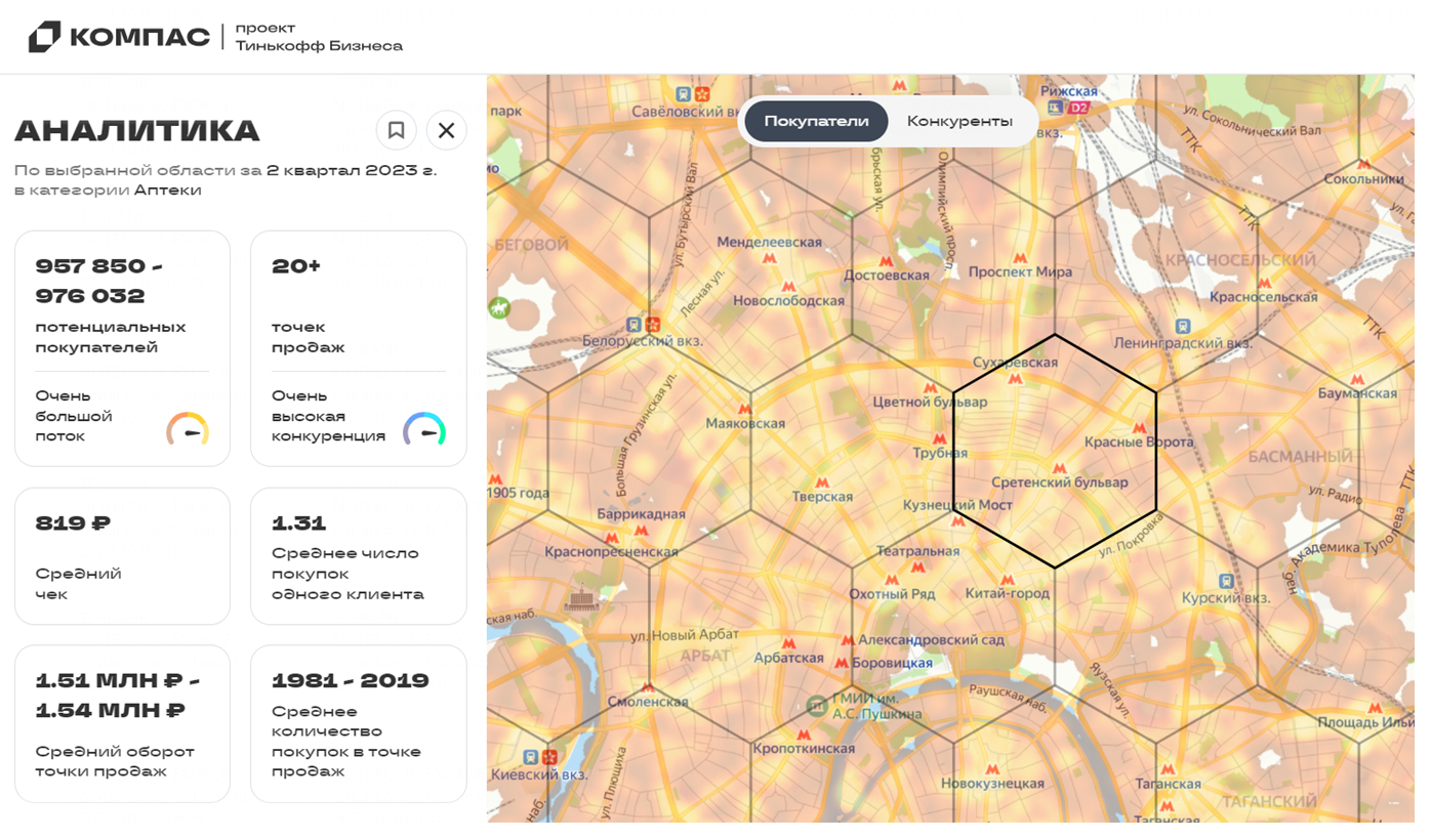 «Тинькофф Бизнес» запустил бесплатный сервис геоаналитики для предпринимателей «Компас». На основе данных о транзакциях пользователей экосистемы «Тинькофф» он может подбирать места для открытия торговых точек в различных районах города. Сервис учитывает трафик покупателей, размер среднего чека, оборот других точек в районе, стоимость аренды и конкурентную среду.