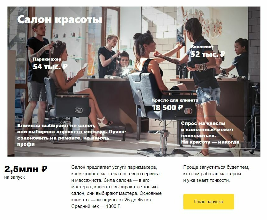 На сайте представлены описания идей семи готовых проектов: пекарни, магазинов фермерских продуктов, цветов, женской одежды, салона красоты, фитнес-центра, кофейни с мороженым. В каждом описании — ориентировочный бюджет, списки оборудования, разрешительных документов и алгоритм подготовки к регистрации бизнеса. Бюджет проектов рассчитан на основе данных Бизнес-навигатора МСП по Москве, а эксперты банка дали рекомендации, как правильно выбрать помещение, сколько нужно сотрудников, как их оформить, какие возникают налоги и как работать с Роспотребнадзором. Каждый план подкреплен реальными примерами.