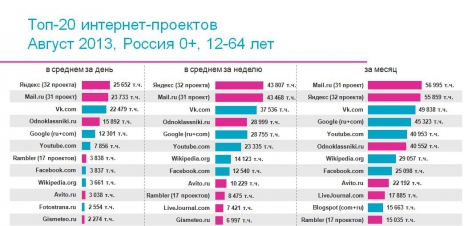 Так, согласно данным TNS за август 2013 года, месячная аудитория 31 проекта Mail.Ru Group составляет 56,995 млн человек. По этому показателю интернет-холдинг является лидером в России.