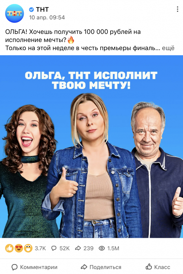Мы знаем, что на ТНТ есть контент для любой целевой аудитории. В нашем кейсе была непростая задача: найти потенциально новую целевую аудиторию и необычный подход к ней. Команда диджитал-маркетинга ТНТ вместе с коллегами из «Одноклассников» довела эту историю до того идеального состояния. Здесь каждая третья Ольга в «Одноклассниках» стала частью нашей промокампании. Результаты кампании в цифрах и лидерство «Ольги» в прайме говорит само за себя. А улыбка Ольги, которая забрала главный приз и приезжала за ним лично, запустила «настроения» не только в «Одноклассниках», но и во всём офисе ТНТ!