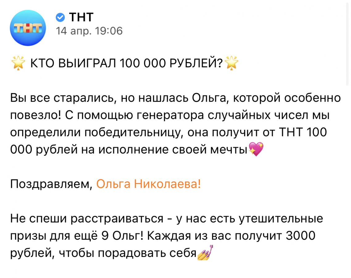- 30 тыс. пользовательниц с именем Ольга получили подарки от ТНТ. Из них десять выиграли денежные призы.
