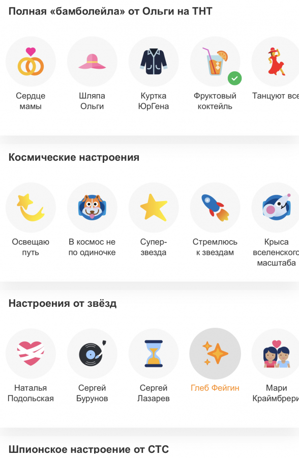 В рамках запуска финального сезона сериала «Ольга» пользователям стала доступна коллекция из тематических настроений ТНТ, посвящённых премьере. Набор носит название «Полная "бамболейла" от Ольги на ТНТ».