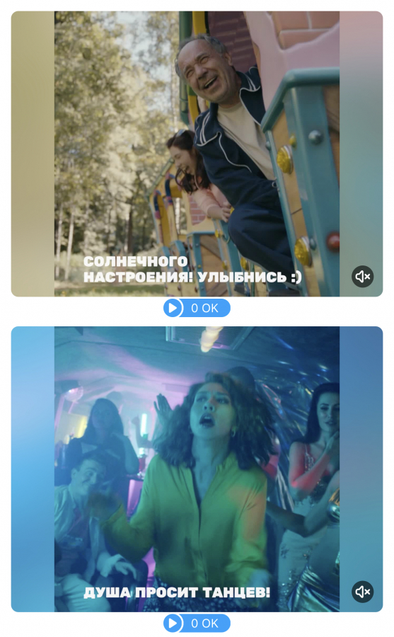 Дополнительно к настроениям пользователи получили возможность дарить видеоподарки с главными героями культового сериала. Видеоподарки — формат виртуальных подарков с видео и звуком от звёзд, который пользуется популярностью у пользователей социальной сети. Универсальные видеоподарки «Ольга» с лаконичными пожеланиями и короткими шутками работают не только на повышение узнаваемости проекта среди аудитории ОК, но и на рост подписчиков в группе ТНТ.