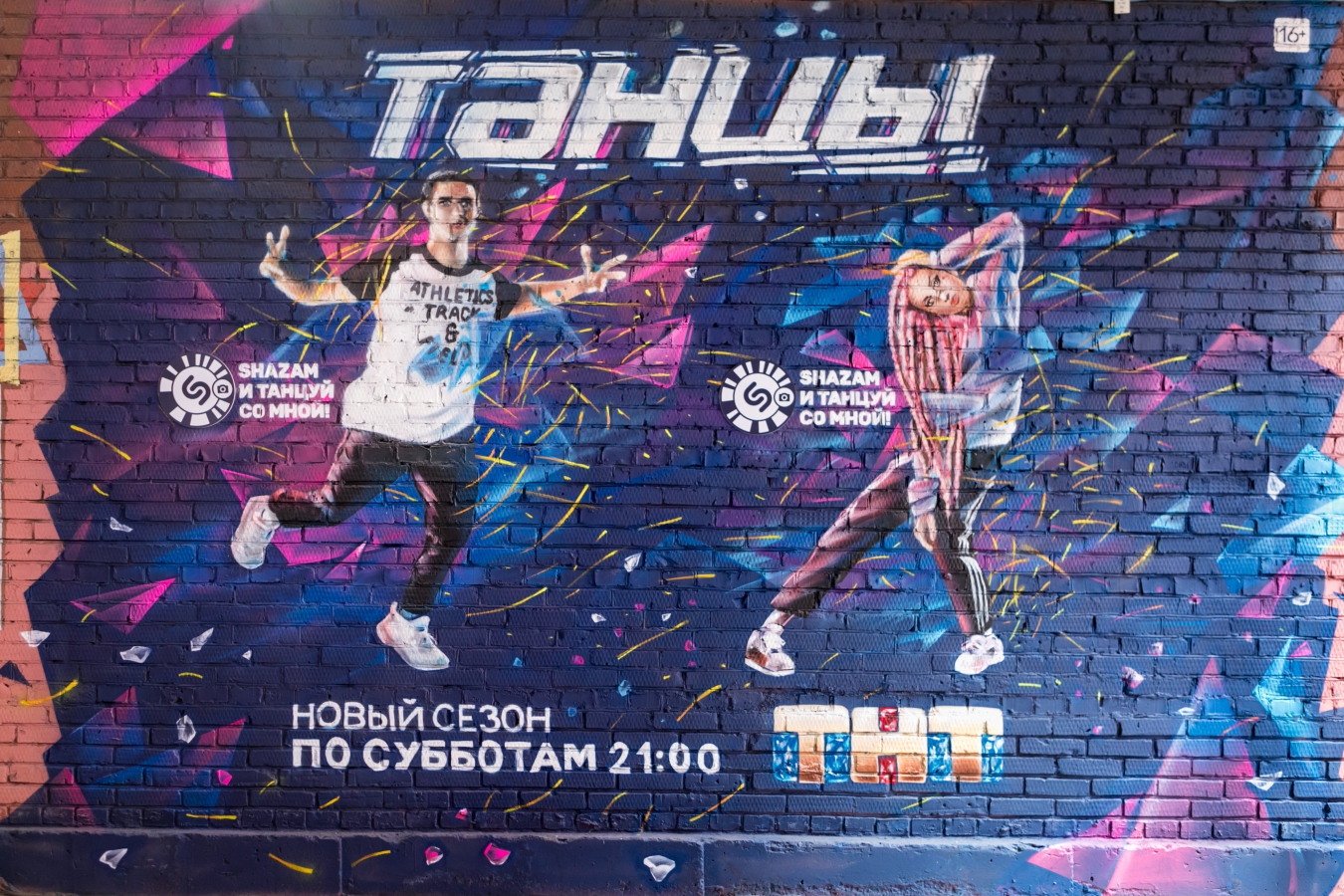 Если можно «зашазамить» песни, значит, можно и танцы. Механика проста: печатные рекламные имиджи с изображением участников шоу «ТАНЦЫ» или нанесенные на поверхность граффити снабжены логотипом SHAZAM и активируются при помощи одноименного приложения, работая по принципу QR-кода.