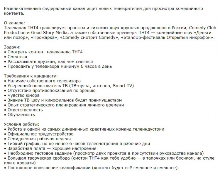 Также телеканал решил #ЧистоПоржать на самом крупном в России портале по поиску работы HeadHunter. Там появилась вакансия на должность телезрителя канала, которому будут платить «хорошим настроением». Перечислены основные требования: без опыта, свободный график, можно работать из дома. Потенциальный соискатель должен быть уверенным пользователем ТВ и обладать собственным оборудованием.