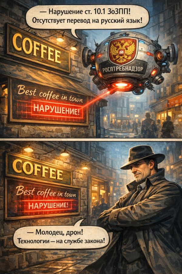 Поправки к закону «О защите прав потребителей» требуют от бизнеса использовать русский язык на всех публичных носителях информации, адресованных потребителям. Это касается вывесок, указателей, информационных табличек, знаков, конструкций и любых других форм размещения информации — включая надписи вроде «открыто»/«закрыто», «распродажа», «скидка», «бесплатно», а также обозначений типа «кофе», «ресторан», «кафе» и «меню», то есть часто используемые вывески на английском языке, должны быть полностью на русском языке. Требование распространяется и на данные об исполнителе или продавце, описания услуг, характеристики товаров, а также условия проведения акций и предоставления скидок.