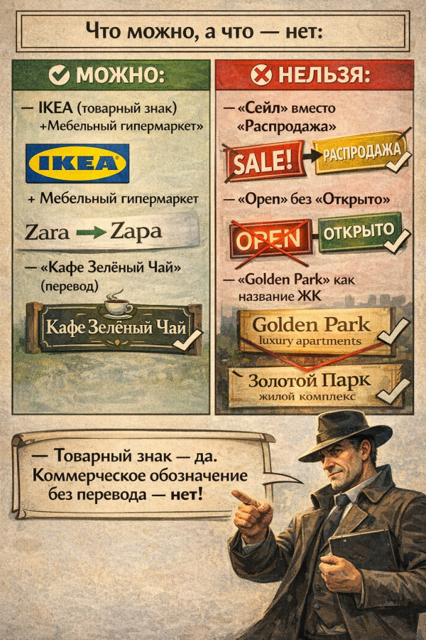 В то же время коммерческие обозначения под исключения не подпадают. Ссылаться на узнаваемость или идентифицирующую функцию вывески на иностранном языке будет недостаточно — использовать их в прежнем виде нельзя.