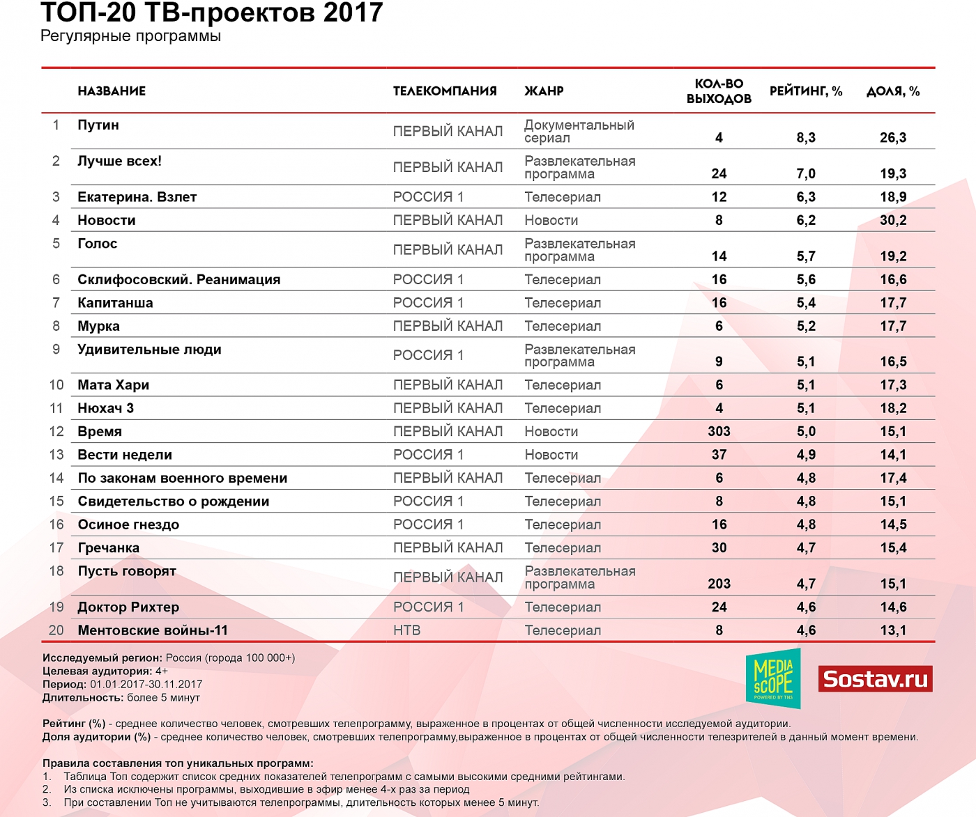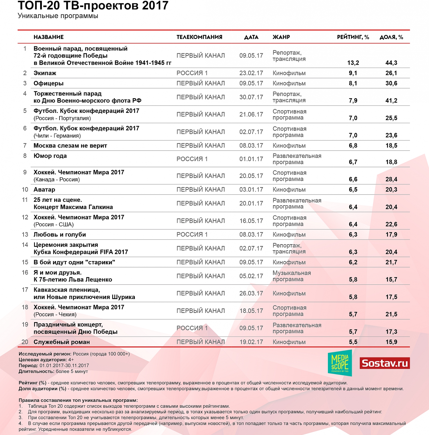 В ТОП-20 уникальных телепередач присутствуют только проекты «Первого канала» и «России-1». ТОП-20 регулярных программ замыкает единственный в этом рейтинге проект НТВ – «Ментовские войны-11».