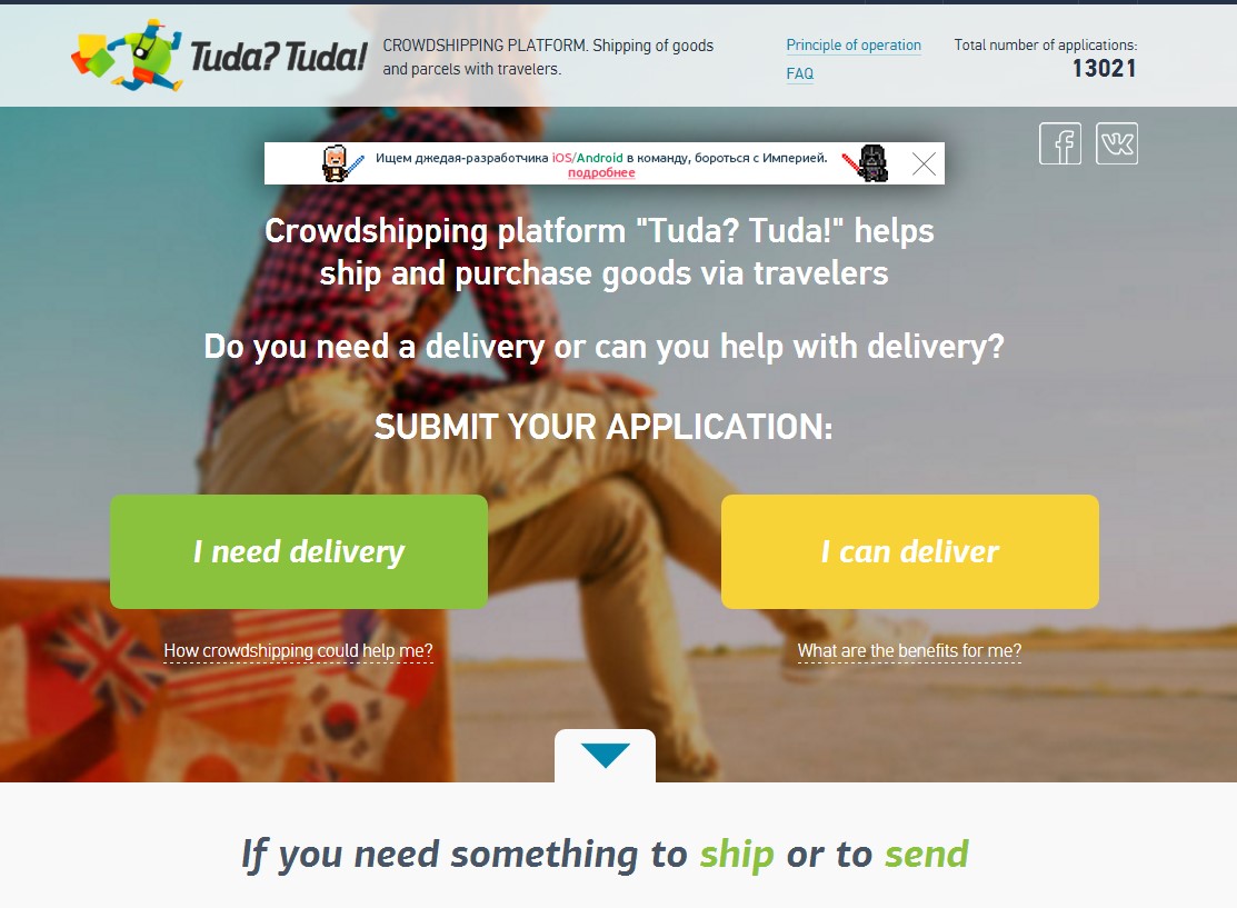 Проект, актуальный для большой по площади России — Tuda? Tuda! — предлагает делать пользователям то, чем раньше занимались их родственники, но более безопасно. Стартап позволяет транспортировать и приобретать товары через путешественников.