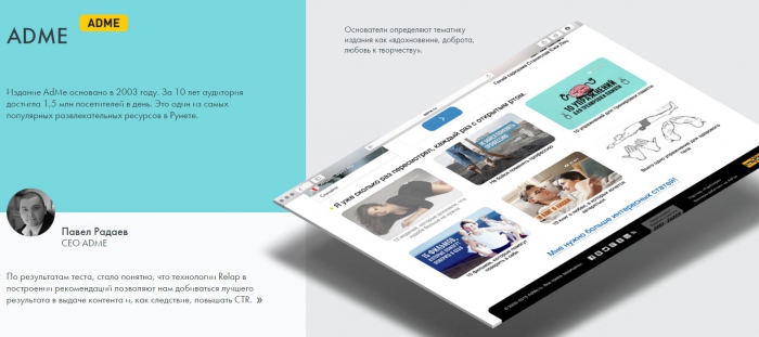 Relap представляет собой B2B-сервис, нацеленный на увеличение времени, которое посетители проводят на сайте. Система рекомендует их с помощью встроенный виджетов. Создатели проекта обещают, что смогут вырастить количество кликов до 30−50%.