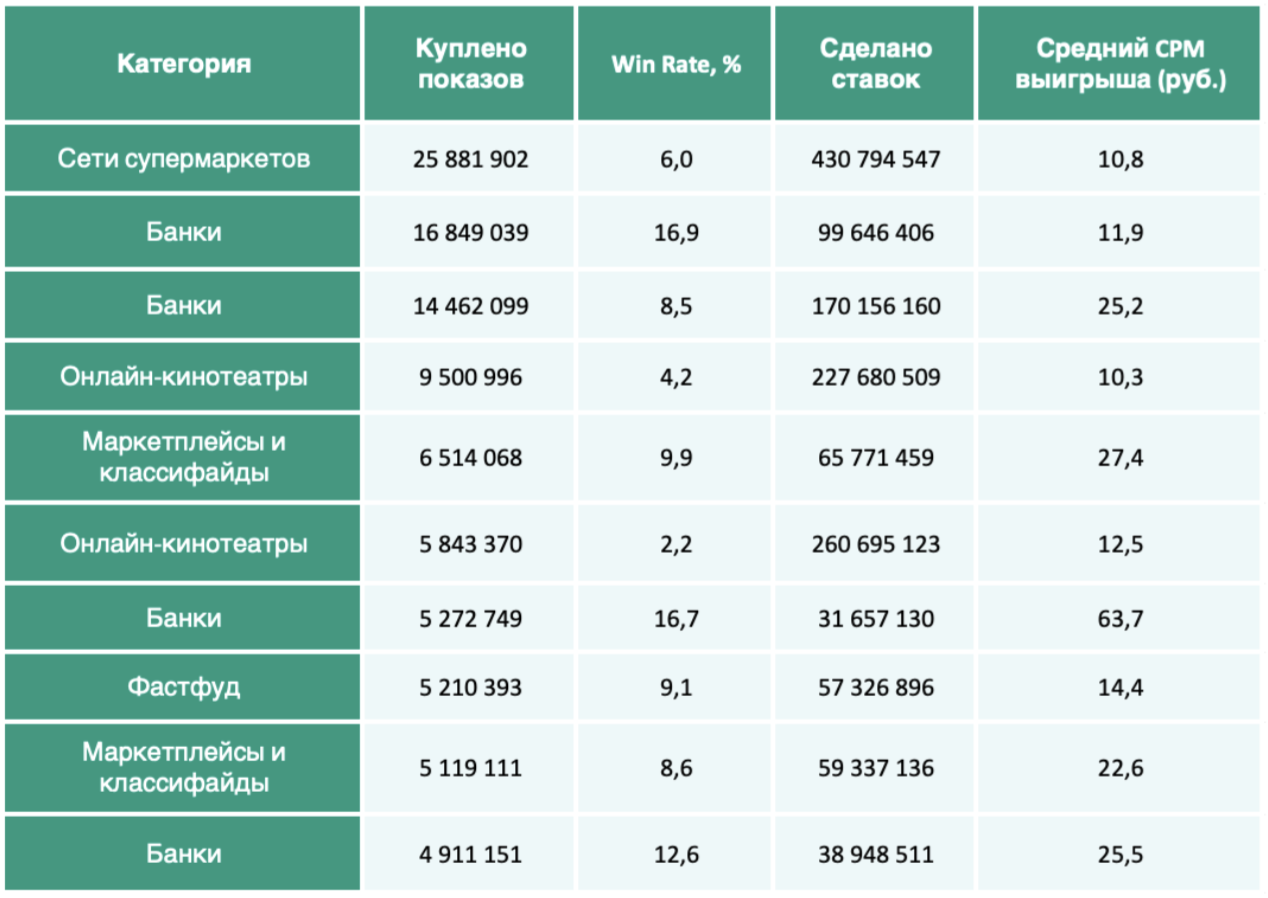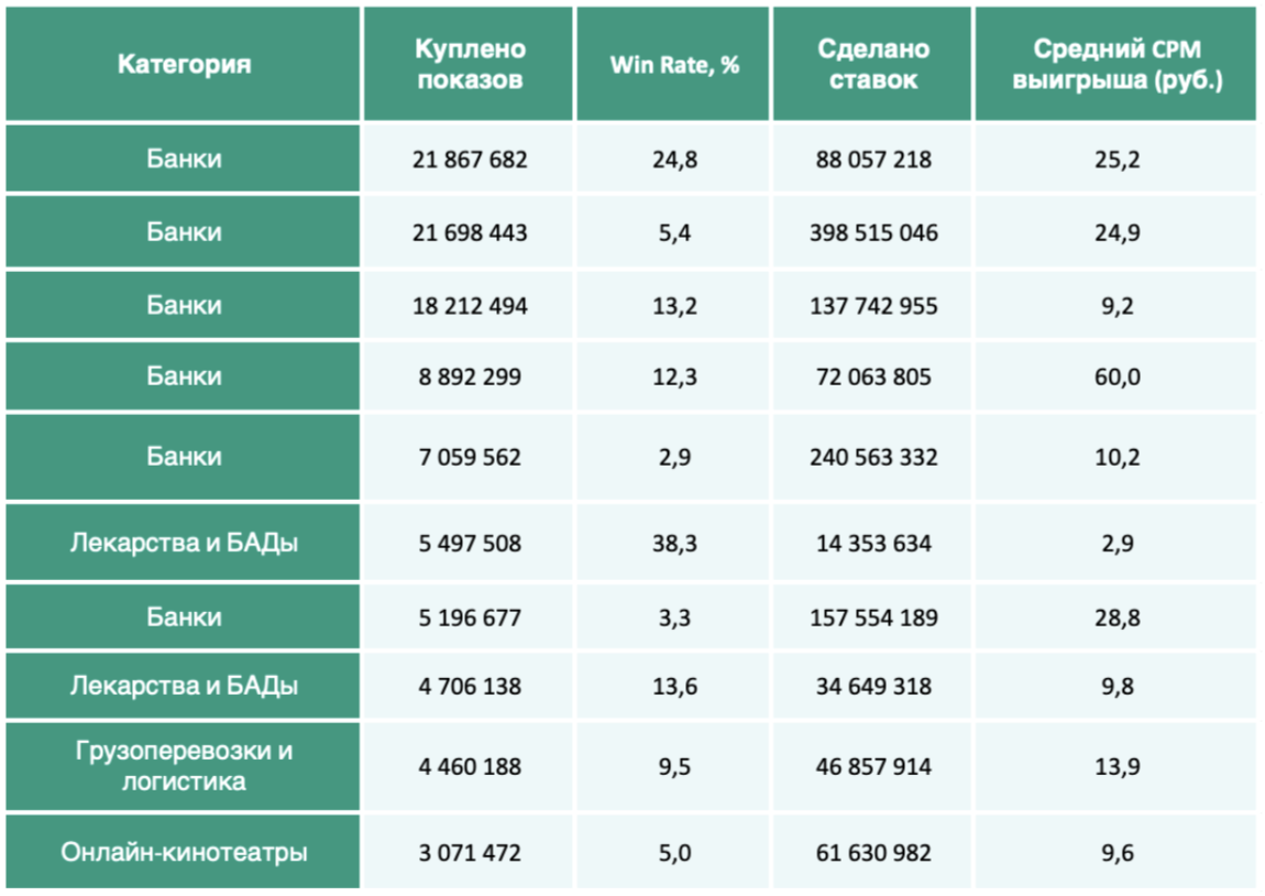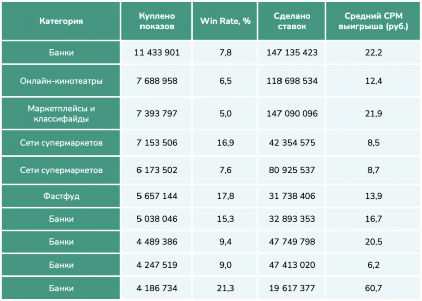 - топ будет именно по самим брендам, а не по сумме всех брендов категории. То есть если банки совокупно выкупили треть всего трафика, и категория «Банки» в этом месяце лидирует, но, например больше всего трафика в абсолютном значении на конкретный бренд досталось видеосервису от телеком-компании, в топ-1 будет бренд категории «Онлайн-кинотеатры»;