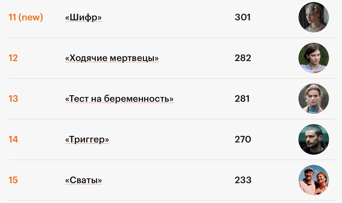 В ноябре топ-20 заметно обновился, в рейтинг попали шесть новых проектов. При этом все они — российские: «Трудные подростки», «Монастырь», «Отпуск», «Девушки с Макаровым», «Шифр», «Тест на беременность».