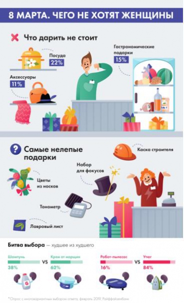 При этом опрошенные дамы рассчитывают, что в этом году они не получат в подарок посуду и кухонные принадлежности, гастрономические наборы, а также различные аксессуары (очки, часы, зонтики и сумочки). В особой немилости — утюг: его не хотели бы видеть среди подарков 84% дам. Женщины также не хотят получить в подарок клубную карту в фитнес (63%) и тостер (61%). Парфюм и косметика также не вошли в список ожидаемых подарков, только духи стали исключением. Не понравятся женщинам и билеты в кино, ужин в ресторане, а также одежду или обувь.