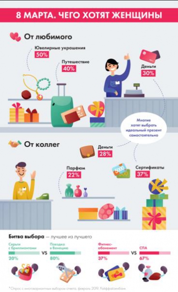 Женщины ждут разных подарков от разных дарителей: от подруг и коллег — сертификаты в SPA (22%) или билеты в театр (18%), от любимых мужчин — отдых у моря (22%) или путешествие на тропические острова (18%). Респондентки также готовы отправиться в романтическую поездку, например, в Париж, Венецию или на остров Санторини.