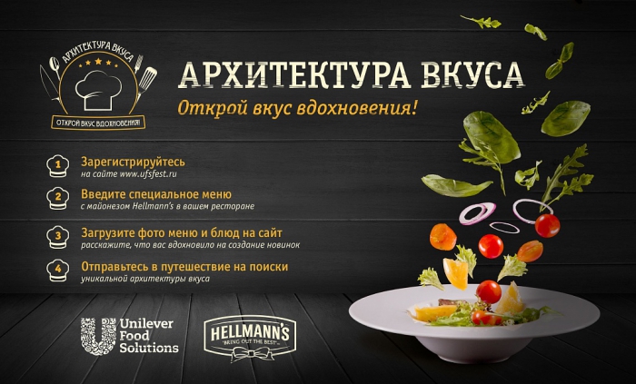 Бренд майонеза Hellmann’s (Unilever) и агентство интегрированных коммуникаций Unite проводят гастрономический фестиваль «Архитектура вкуса» с конкурсами сразу для двух аудиторий: шеф-поваров и посетителей ресторанов.