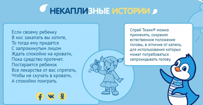 Для этого конкурса на сайте был создан раздел «Некаплизные истории», в котором рассказывается, как дети избегают закапывания в нос. Десять коротких смешных стихотворений в стиле Григория Остера с уникальными иллюстрациями к каждому из них призваны не только поднять настроение маме и ребенку, но и дать возможность проявить себя творчески.
