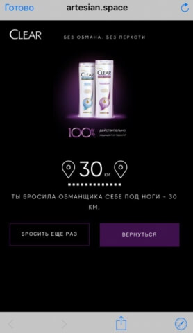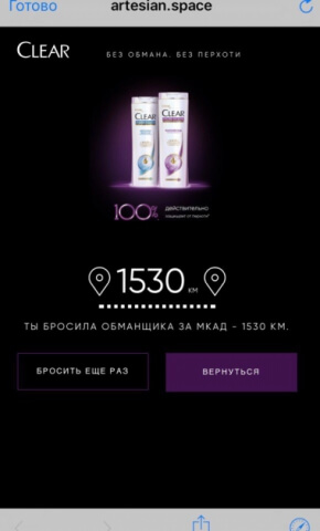Рекламная кампания запущена в поддержку бренда Clear. В ролике фокусируется внимание на том, что шампунь Clear выполняет свои обещания и действительно защищает от перхоти. Во время просмотра рекламы можно переключиться на игру с коммуникацией «Не позволяй себя обманывать», где нужно нажатием на экран или пробел сделать так, чтобы обманщик улетел как можно дальше (за МКАД, в другие страны, на другие планеты).