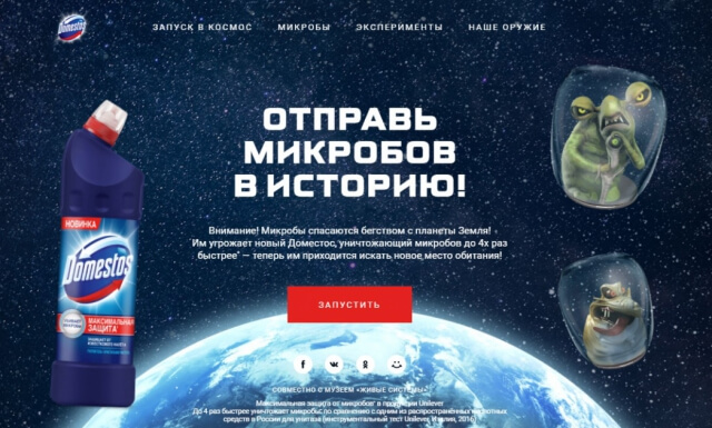 Главная задача, которая стояла перед агентствами — рассказать о том, что новый чистящий гель Domestos убивает микробы до 4 раз быстрее, а также поддержать кампанию по запуску бактерий в космос. Этот эксперимент проходил при участии музея «Живые системы» на аэродроме в Переславле-Залесском. (Обзор на Составе).