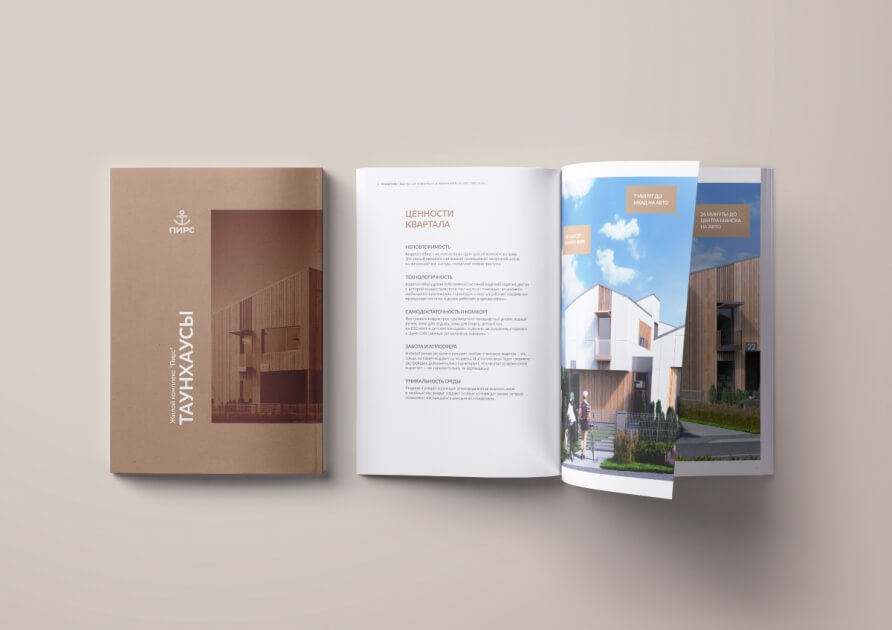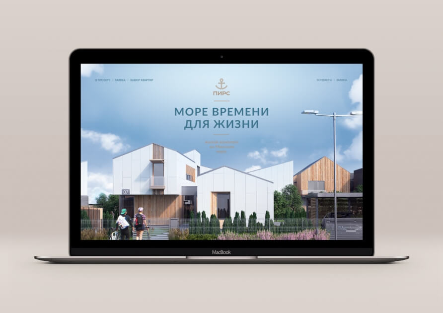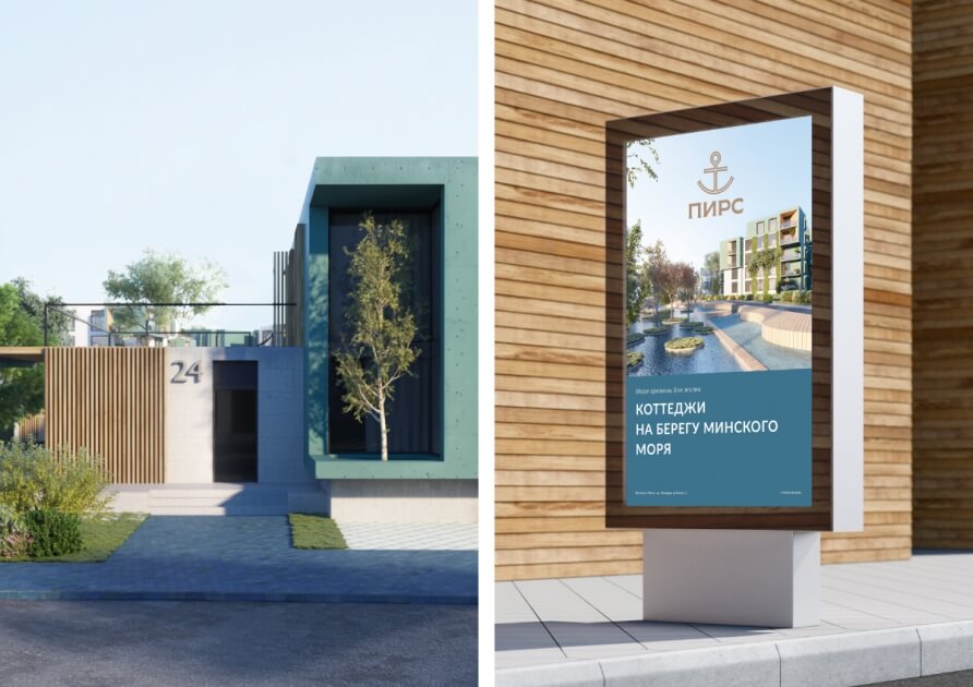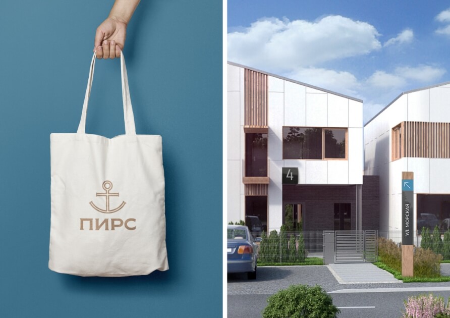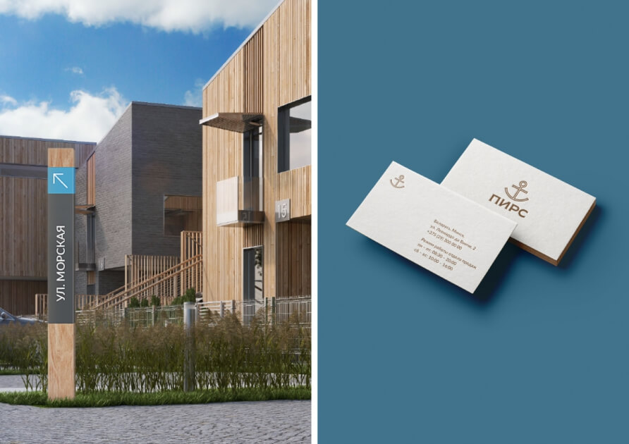 Визуальным символом «Пирса» стал якорь, который, с одной стороны, поддерживает морскую тему, с другой, символизирует дом как жизненный причал. Идею экологичности, единения с природой и отдыха у воды транслирует сдержанная и благородная цветовая гамма айдентики — сочетание глубокого синего и натурального песочного оттенков. Они создают ощущение расслабленности и спокойствия, добавляют кварталу у моря особый колорит и стиль, которого не хватает мегаполису. Концепцию квартала-курорта усиливает слоган «Море времени для жизни», рисующий картину неспешного и наполненного бытия в гармонии и собой и окружающим миром.