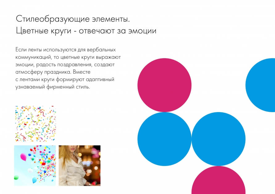 Фирменный стиль также был дополнен вторым цветом, малиновым. Так, бренд стал более эмоциональным, ярким, с изюминкой. Неформальность коммуникациям добавляют игривые круги-шары, символизирующие радость поздравлений, импульсы восторга и привносящие в айдентику тепло и атмосферу праздника.