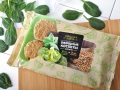Отдельное внимание было уделено выбору цвета и материала упаковки. Зелёный цвет подложки придает продукту больше аппетитности, а выборочная матовая поверхность плёнки вызывает правильные и приятные тактильные ощущения. В дизайне упаковки изображены ингредиенты, а сам продукт можно увидеть в специальном прозрачном окне.