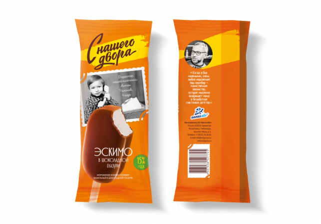 Многие люди будучи взрослыми ностальгируют по детству и убеждены, что «раньше было лучше». Для них был придуман бренд «С нашего двора». Лакомство, которое создает предвкушение праздника для ребенка, живущего внутри каждого из нас. В дизайне использованы цитаты и детские фотографии создателей мороженого. Это обращение к аудитории на эмоциональном уровне, которое дает возможность еще раз почувствовать беспечность и беззаботность детства.