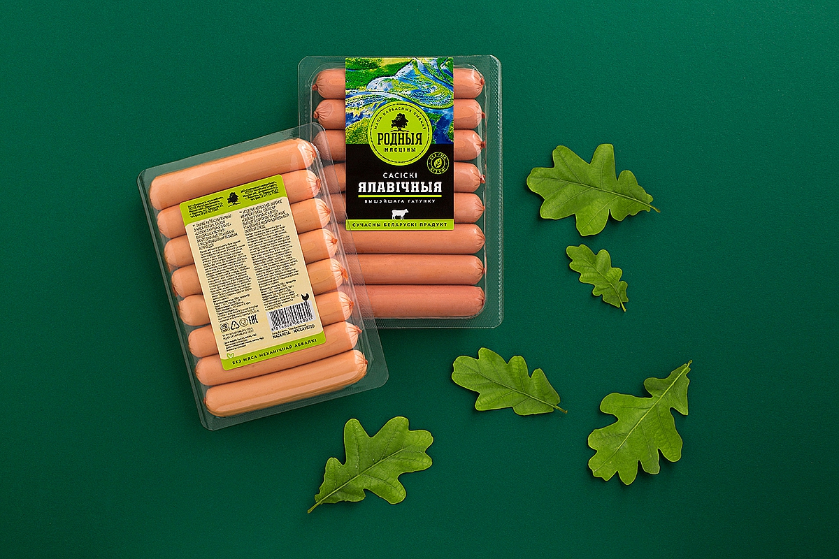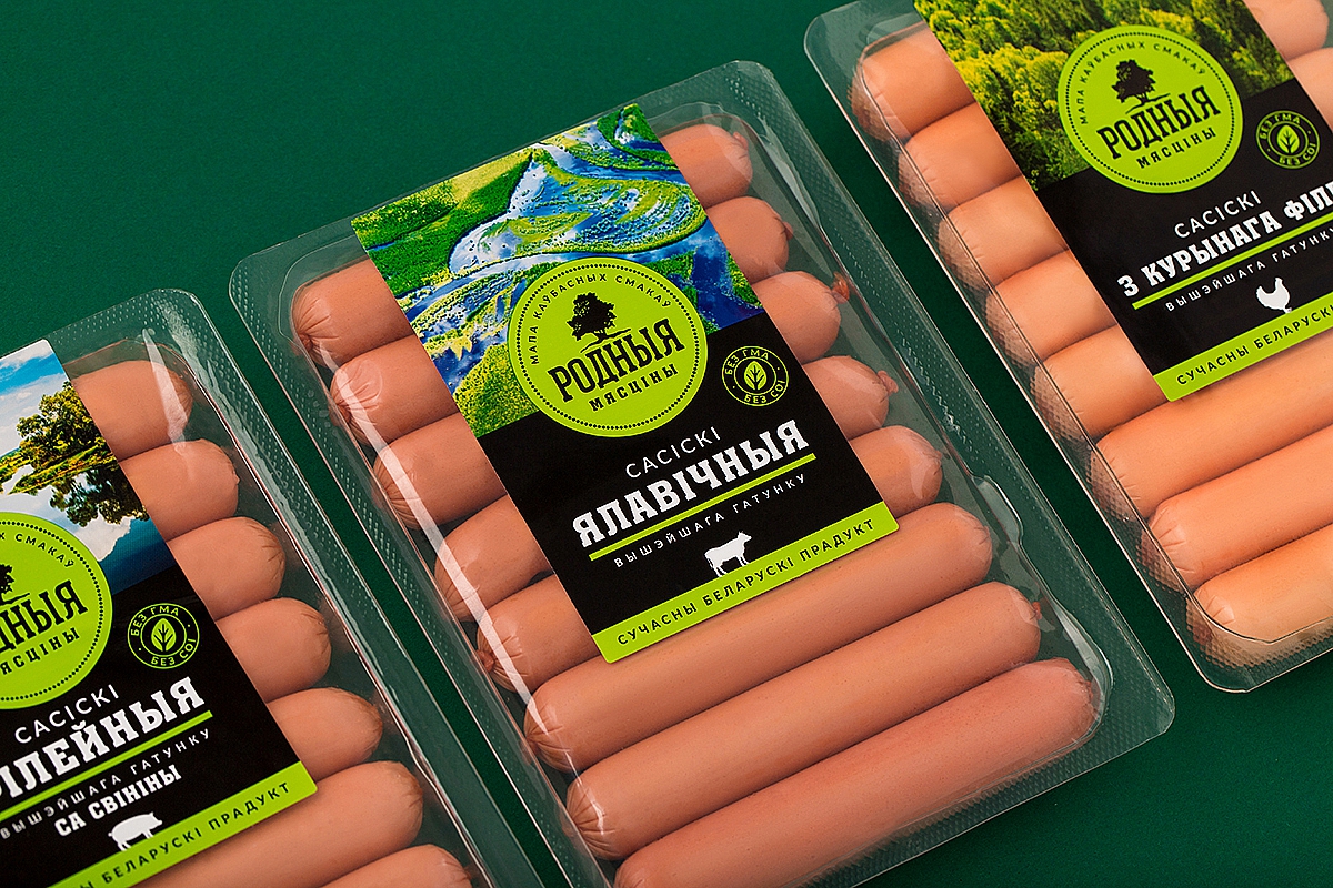 Детская продукция бренда «Родныя мясцінкі» перенимает дизайн материнского бренда, но цвета стали более яркими, их сочетание — более мягким, а вербальная коммуникация — более ласковой.