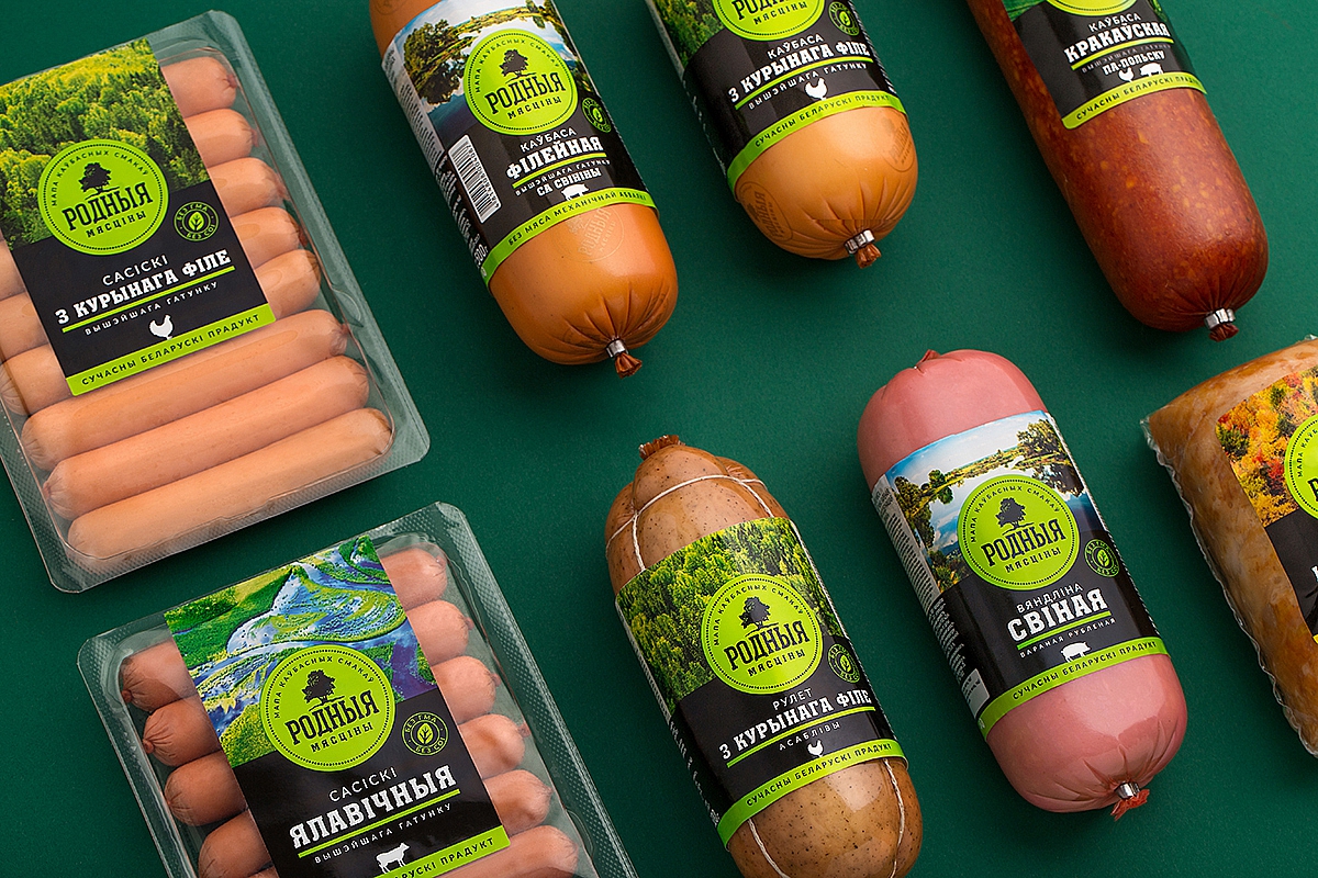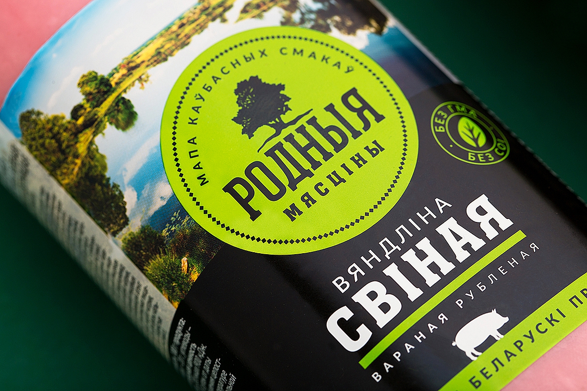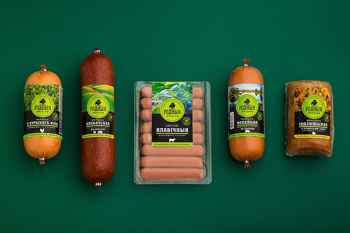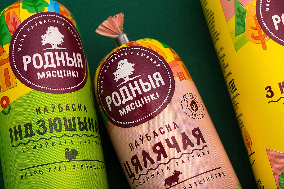 Нейм «Родныя мясціны» («Родные места») рассказывает про белорусское происхождение марки, а также создает сильную эмоциональную связь между брендом и покупателем. Слоган «Мапа каўбасных смакаў» («Карта колбасных вкусов») поддерживает нейм и отсылает к таким современным гастрономическим понятиям, как винная или сырная карта, повышая тем самым статус продукта.