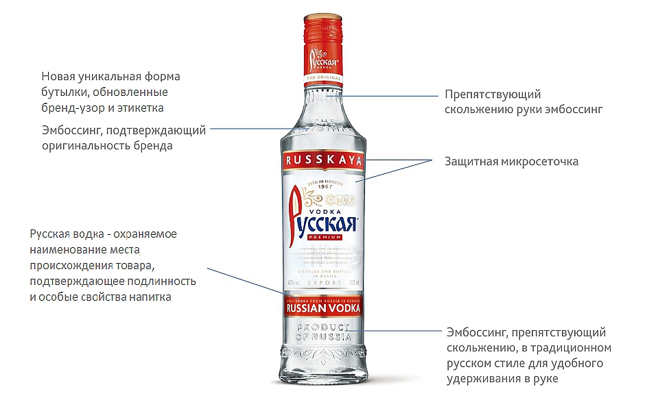 Препятствующий скольжению руки эмбоссинг в традиционном русском стиле и специальная защитная микросеточка на этикетке обеспечат дополнительную защиту от подделок.