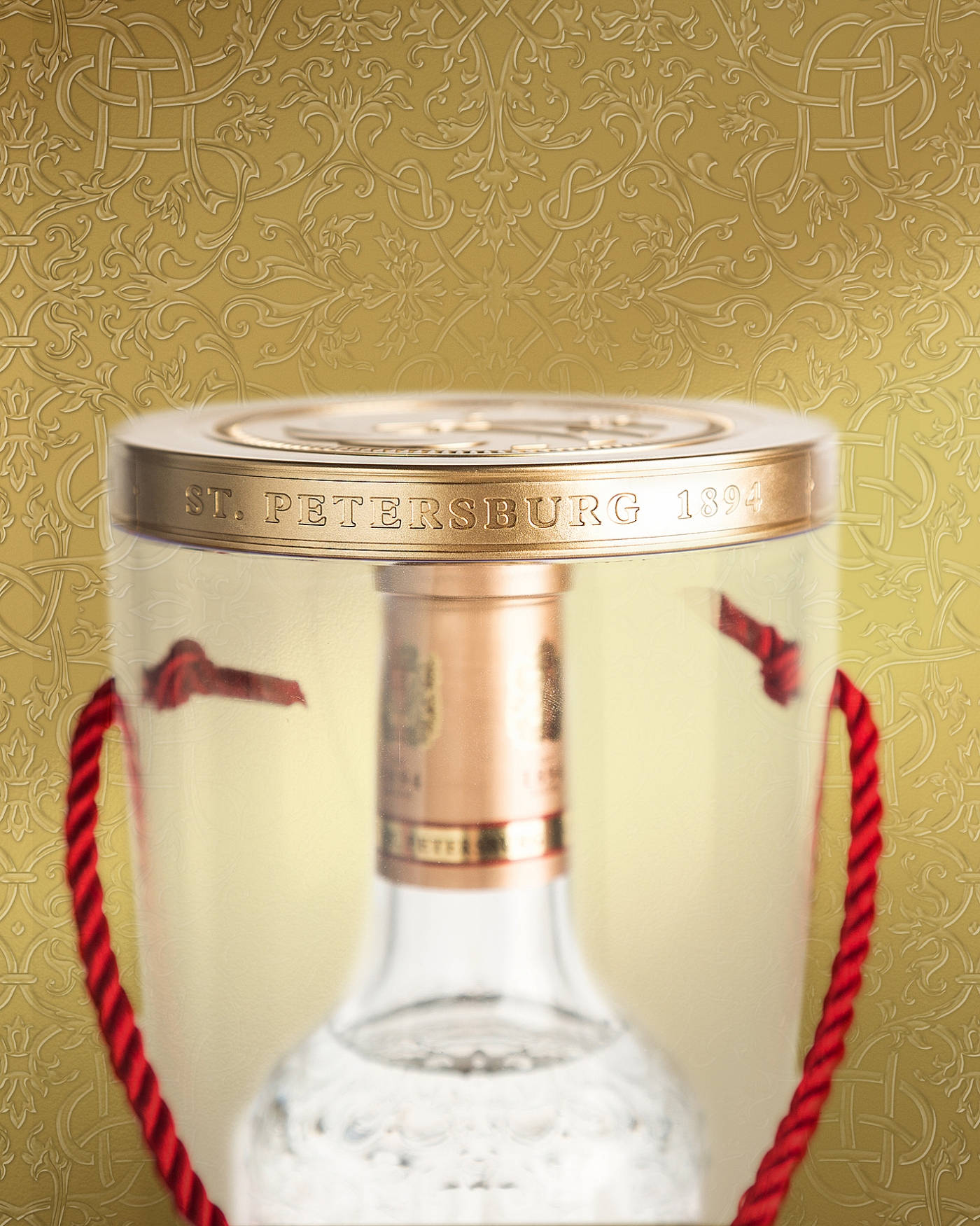 Новая упаковка «Русского Стандарта Gold» в современном дизайне имеет цилиндрическую форму и выполнена из прочного прозрачного пластика, что выгодно подчеркивает всю красоту оригинальной бутылки «Русского Стандарта Gold» и делает ее более заметной на полке. Упаковку дополняют основание и крышка из литого пластика золотых оттенков с тиснением, верх крышки украшает изображение орла и медведя. Красная ручка тубуса из шелковистой плетеной тесьмы гармонично перекликается с цветовой гаммой этикетки.