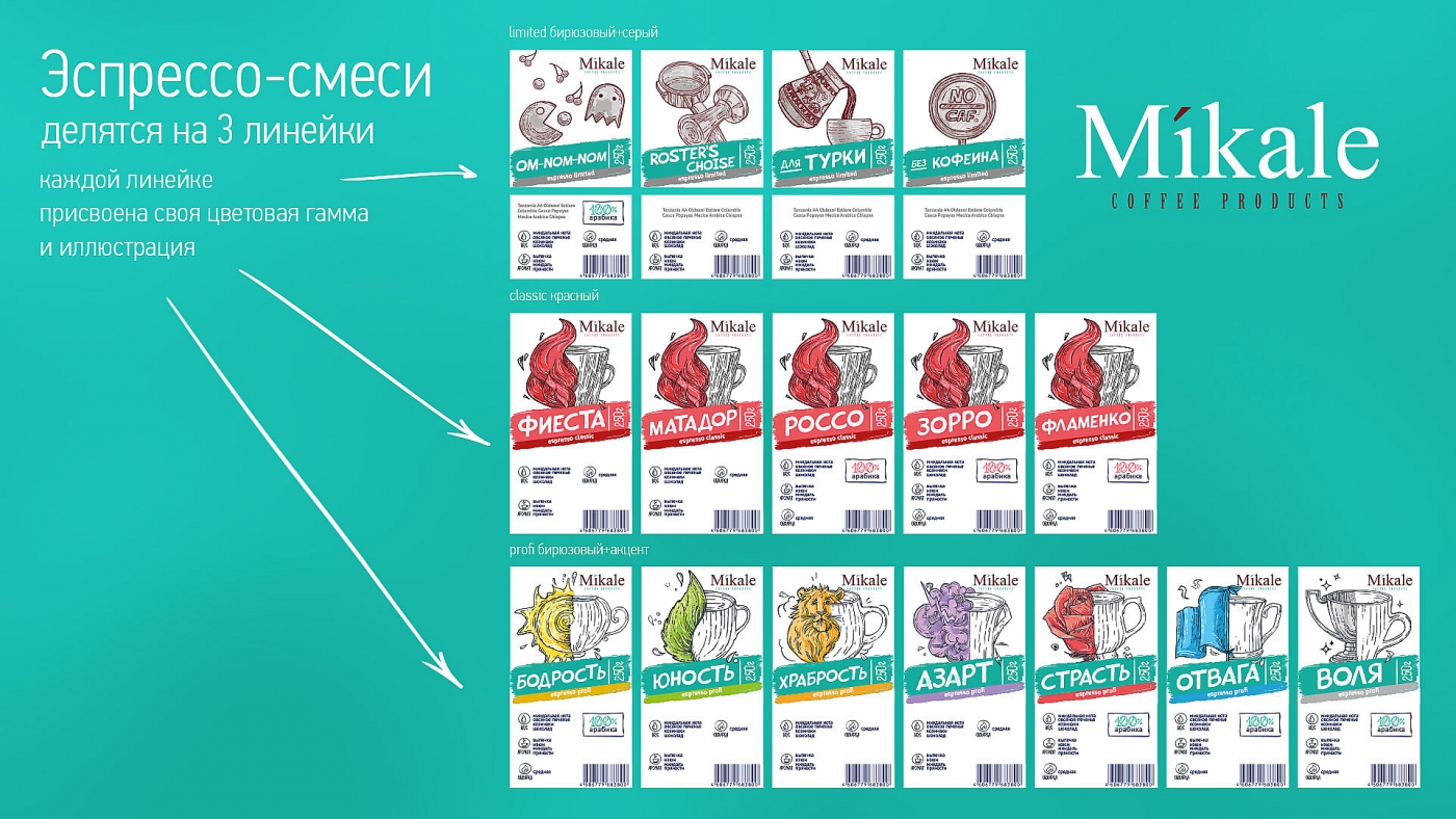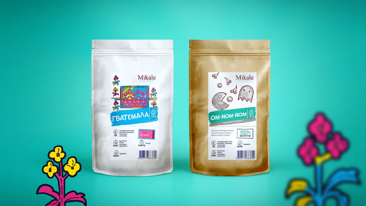 Для сферы кофе — это довольно смелая подача, разрывающая привычные шаблоны: бежево-кофейные оттенки, сдержанность и лаконичность, одинаковый показ фуд-зоны: дымящаяся чашка кофе. В Mikale всё наоборот -белый чистый фон и «кричащие» фантазийные иллюстрации.