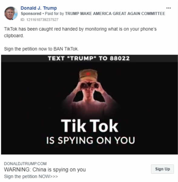 Реклама размещалась в Facebook и Instagram. В 30-секундном ролике зрителей предупреждают, что TikTok «шпионит» за ними и берет данные из буфера обмена на смартфонах, а также из других приложений. В тексте объявления предлагалось подписать петицию за запрет видеоплатформы, ссылка вела на сайт action.donaldjtrump.com.