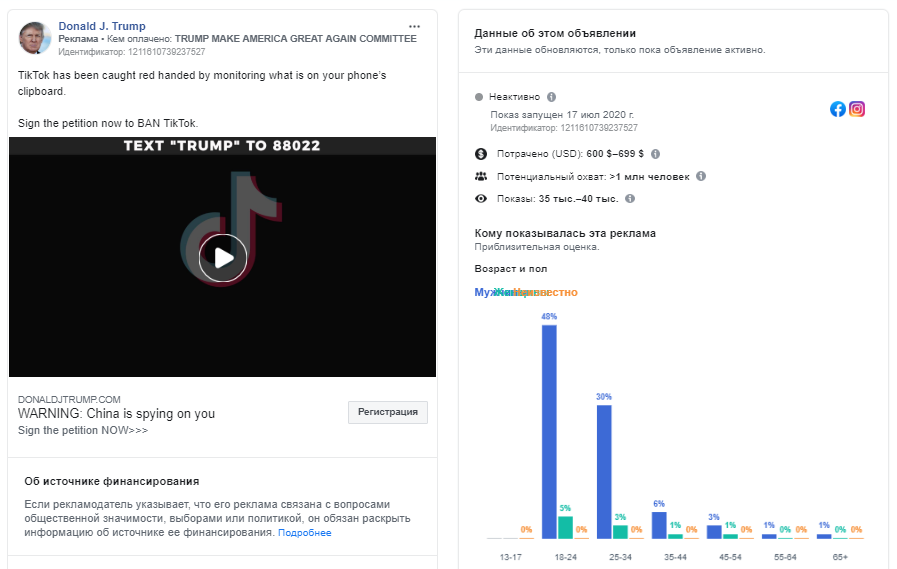 Президент США Дональд Трамп через рекламную кампанию призвал аудиторию прекратить пользоваться видеосервисом TikTok. Объявление размещено в Facebook Ad Library.