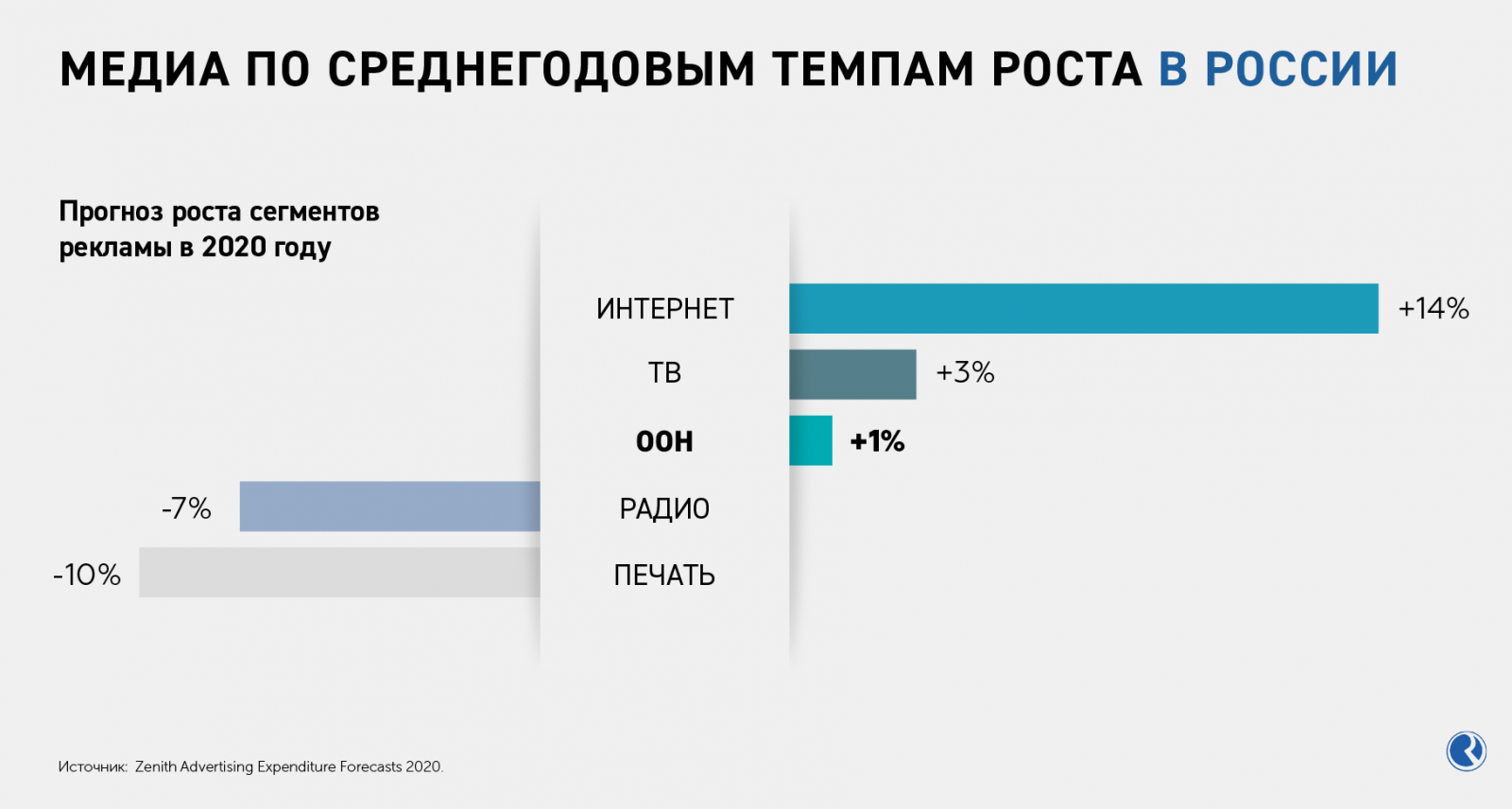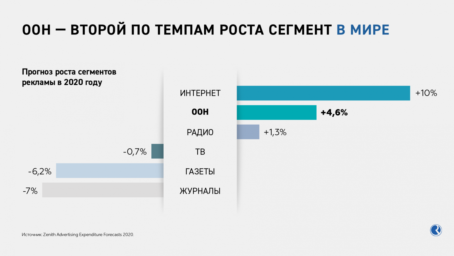 «В мире наружная реклама занимает второе место по темпам роста после интернета. В России же по прогнозам роста сегментов рекламы в 2020 году ООН будет на третьем месте. Тем не менее, при том, что в мире доля ООН стабильна, в российском медиамиксе она снижается — за последние 10 лет она упала с 18% до 9%», — рассказал Пешняк.