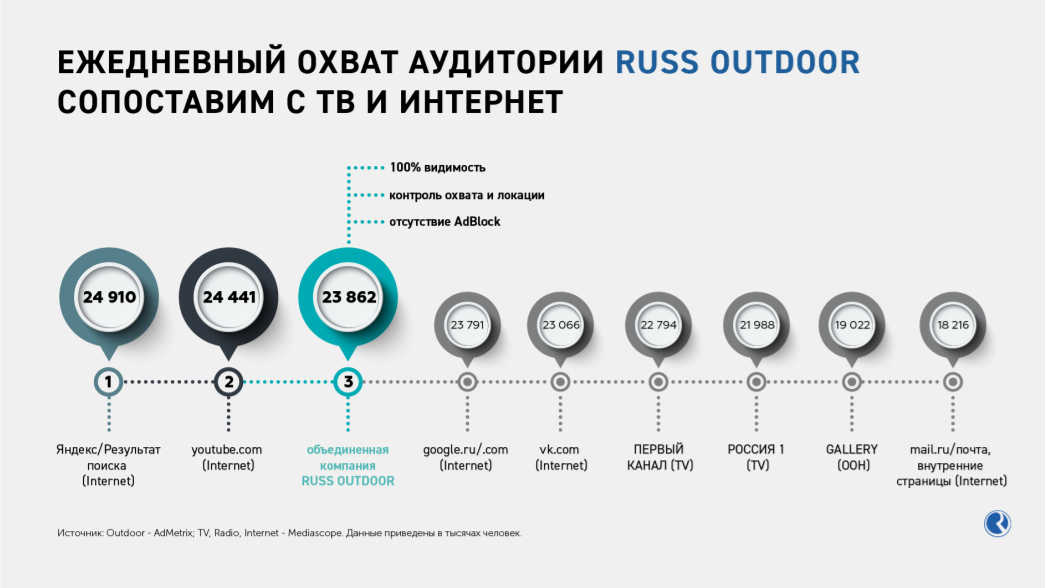 Несмотря на падение доли ООН, Пешняк считает, что сегмент out-оf-home (OOH) имеет огромный потенциал роста в России, так как предлагает самую выгодную стоимость за контакт среди других медиа-каналов и имеет большой охват, сопоставимый с ТВ и интернетом
