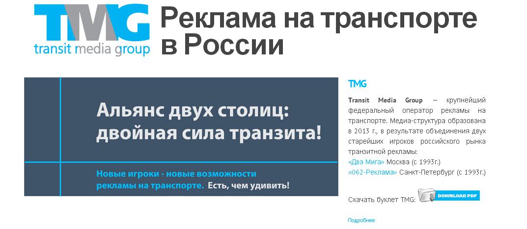 Компания Transit Media Group (TMG) объявила о запуске новой системы размещения рекламы. Она разработана для коммерческого транспорта Москвы и основана на разбивке столицы по кластерам. Сроки запуска рекламной кампании по новой системе сократились с 3-х недель до 10 дней, для программ экспресс-запуска — до 3 дней.